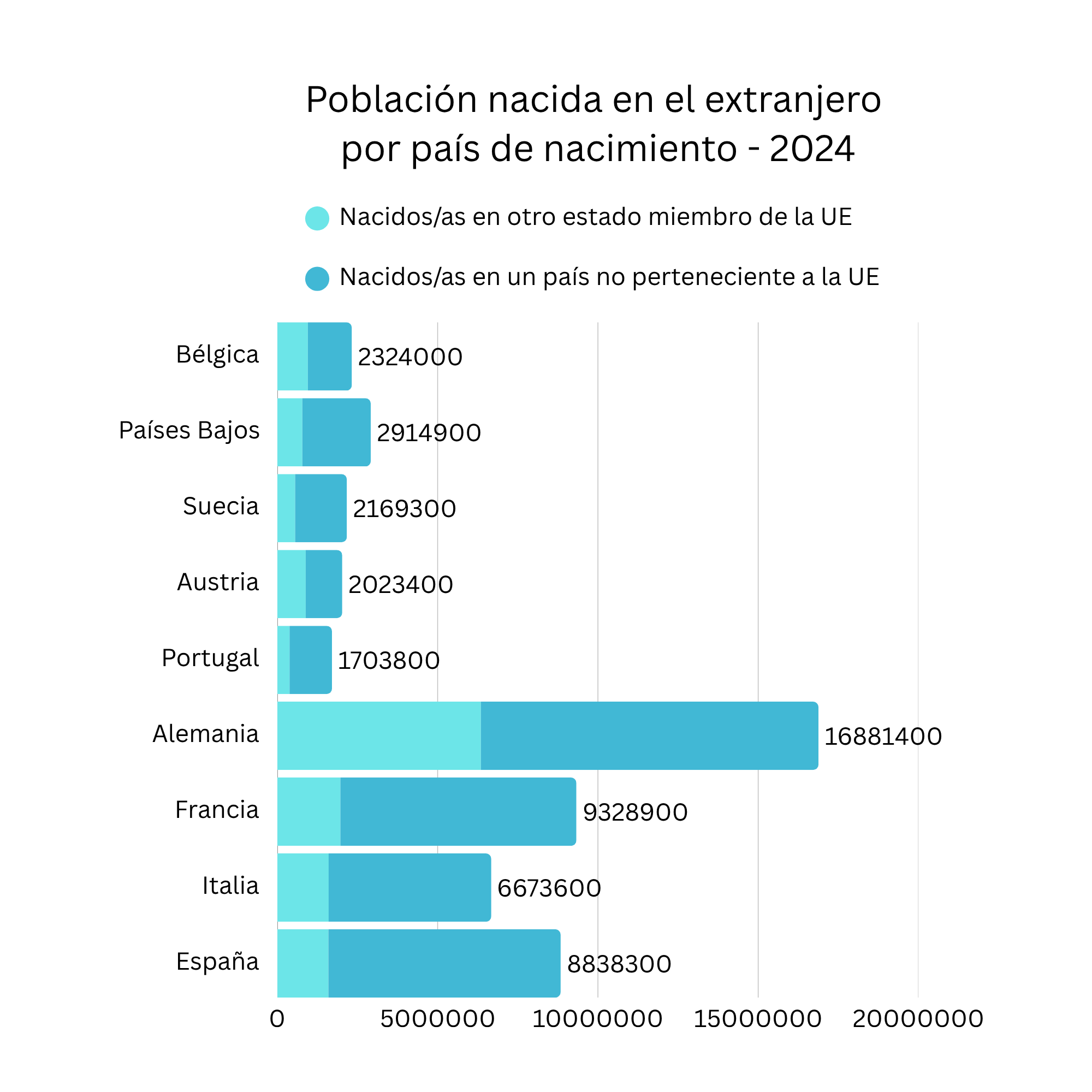 Solo en cifras, el mayor porcentaje de personas nacidas en el extranjero en un país de la UE lo ocupa Alemania, con más de 6 millones de personas nacidas en otro Estado miembro de la UE y más de 10 millones de personas nacidas fuera de la UE. Le siguen de cerca Francia, Italia y España, con más de 1 millón de personas residentes nacidas en otros países de la UE y más de 5 millones de residentes nacidas fuera de la UE cada uno.