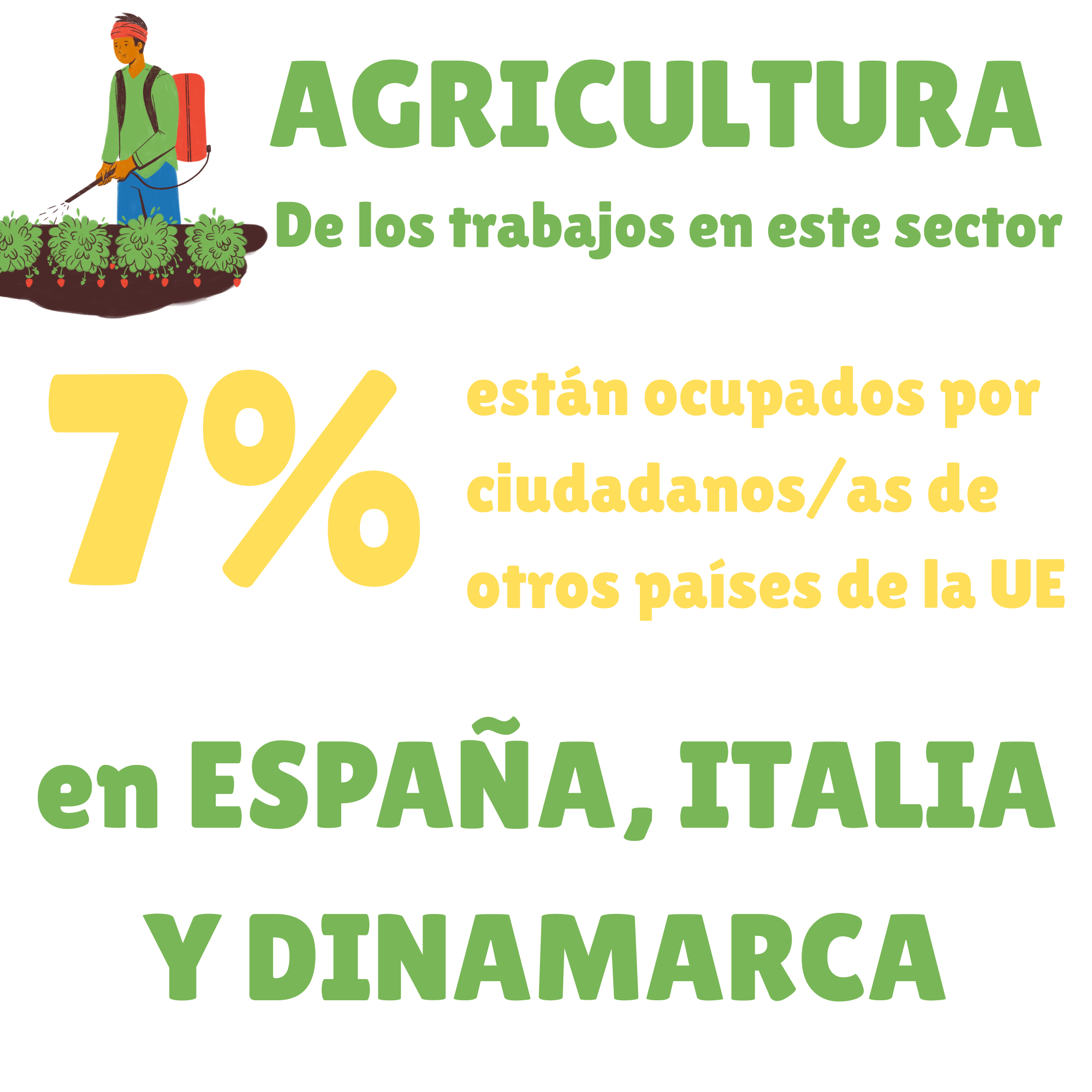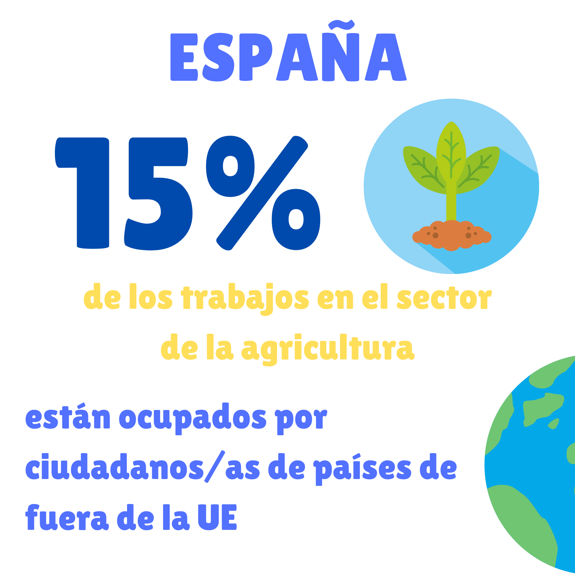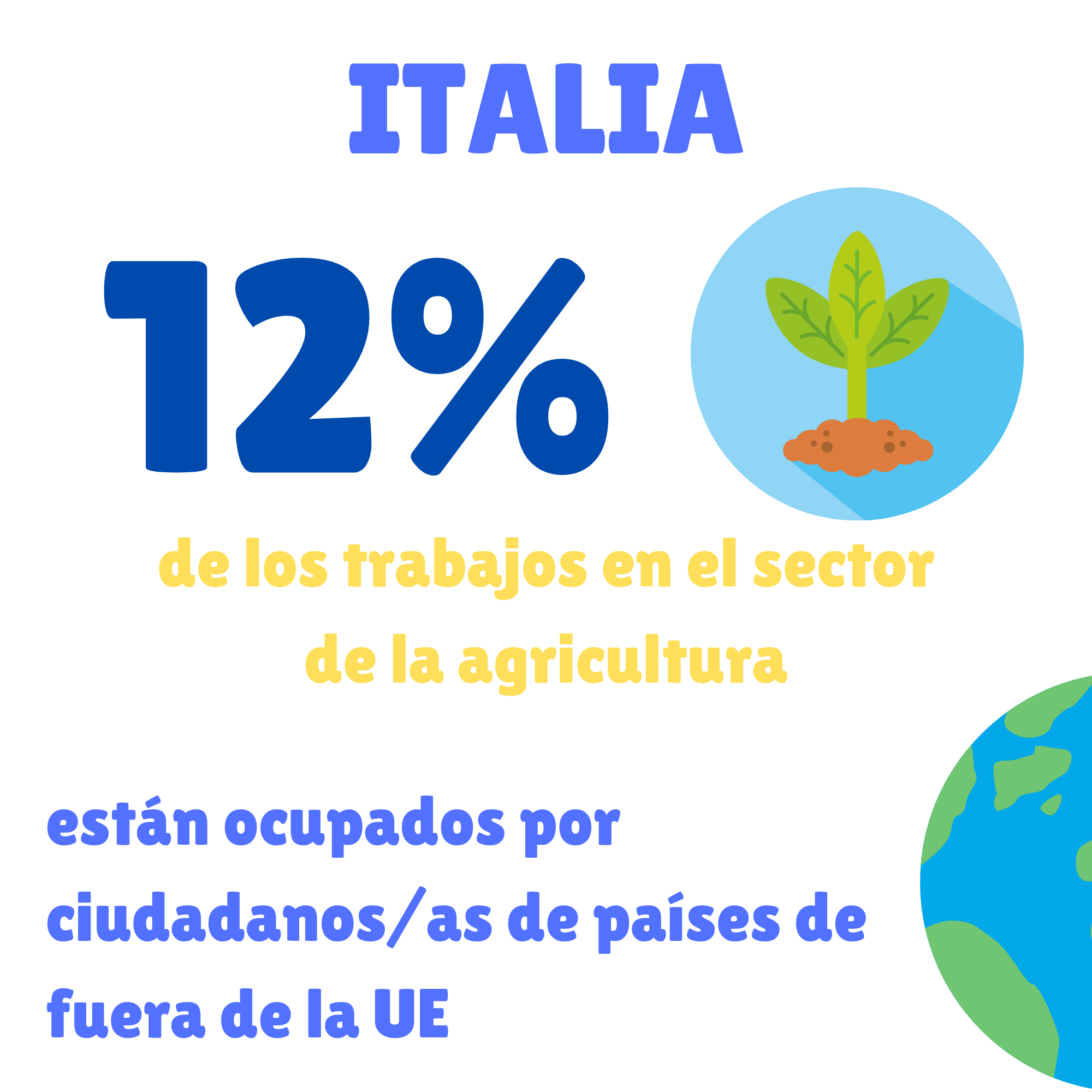 Las estadísticas se vuelven aún más sorprendentes al observar un sector diferente: el agrícola. El 7% de los empleos en la agricultura en España están cubiertos por inmigrantes nacionales de la UE y el 15% incluso por nacionales de países no pertenecientes a la UE. Esto significa que más del 20% de la fuerza laboral agrícola está compuesta por ciudadanos/as no españoles/as. Italia se enfrenta a la misma situación, aunque con un 12% de ciudadanos/as no comunitarios/as. Con estas cifras queda claro que existe una fuerte dependencia del trabajo migrante en la agricultura.