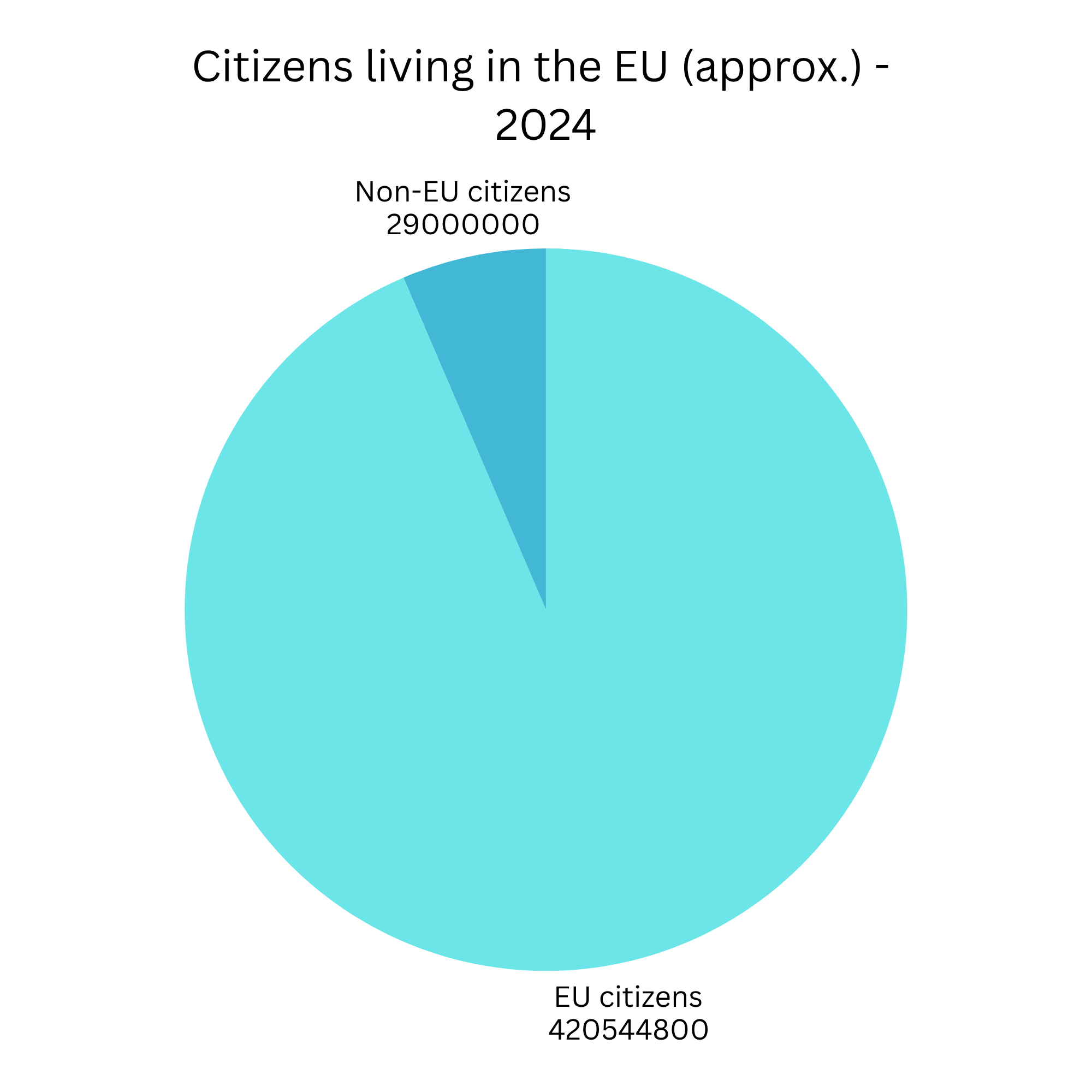 29.0 million people (6.4%) of the 449.3 million people living in the European Union (January 2024) were non-EU citizens. This means, that they were neither from the country they were residing in, nor from another EU member state. This translates to 1 in every 16 people is a migrant. If that sounds like a lot, maybe this can give you something to rethink that: