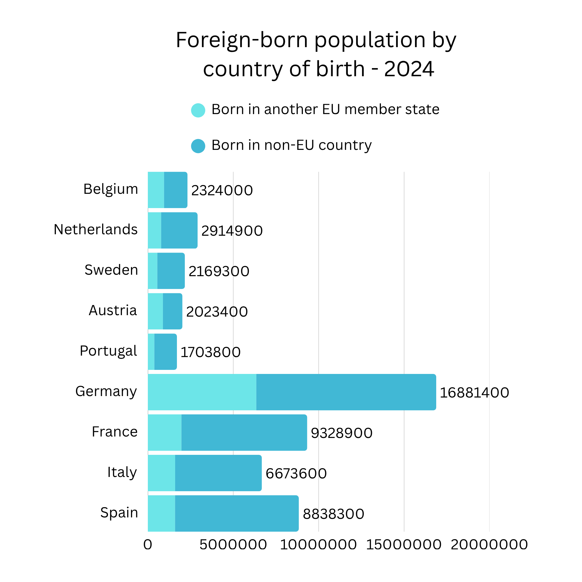 In numbers only, the highest share of foreign born individuals in an EU country, is Germany with having over 6 million people born in another EU member state, and over 10 million people born outside of the EU. This is followed closely by France, Italy and Spain, with all three countries having over 1 million other EU-country born residents, and over 5 million non-EU born residents each.